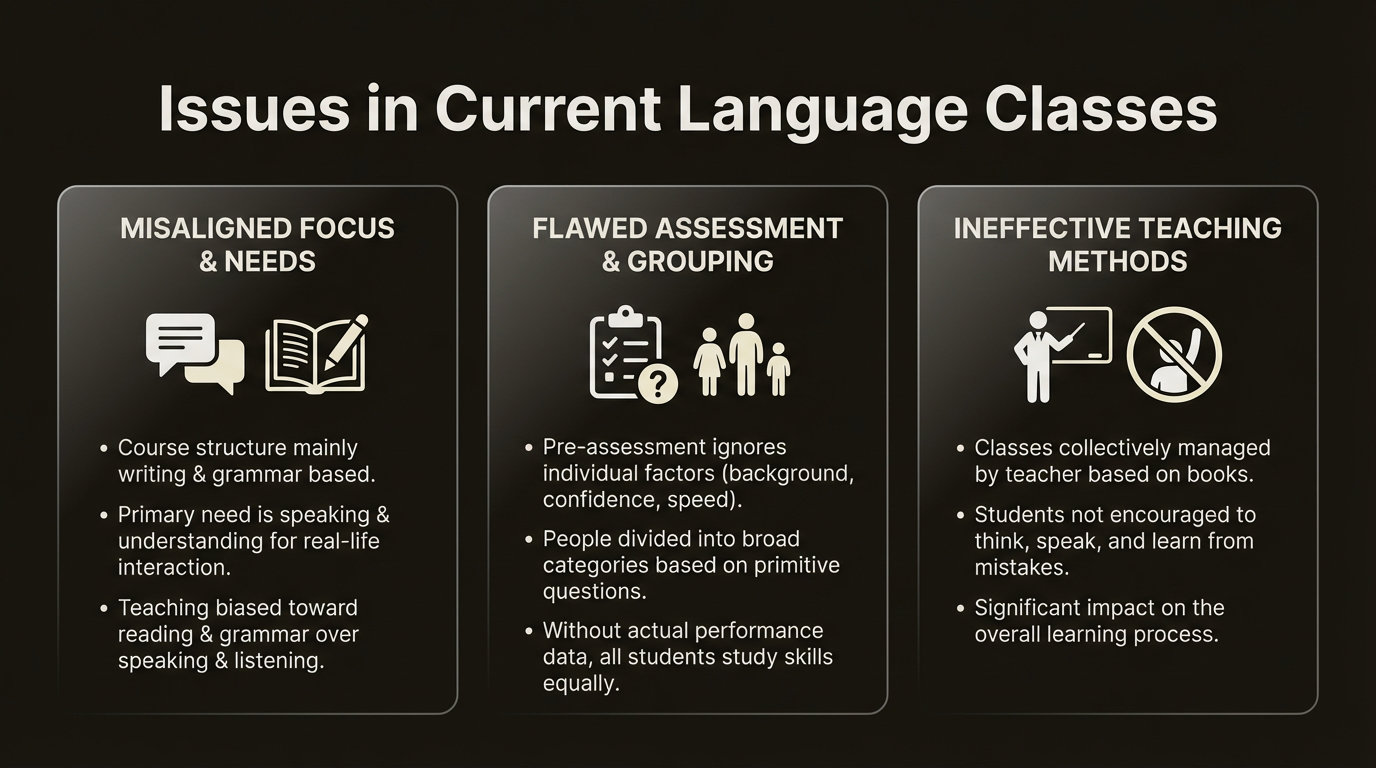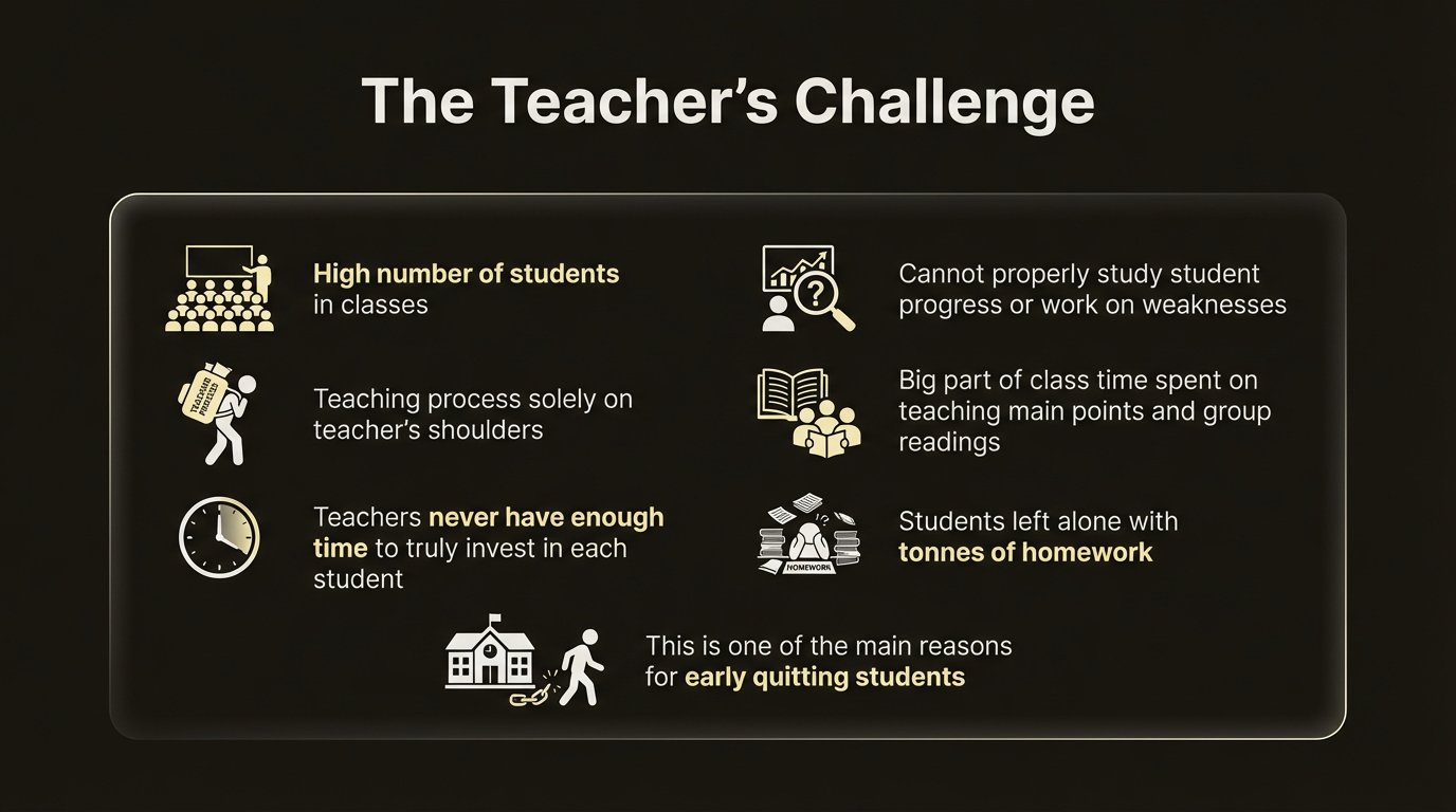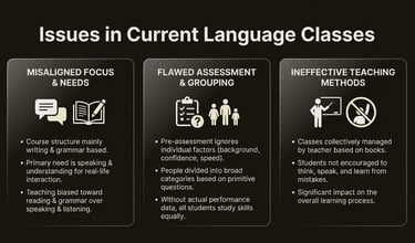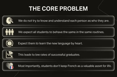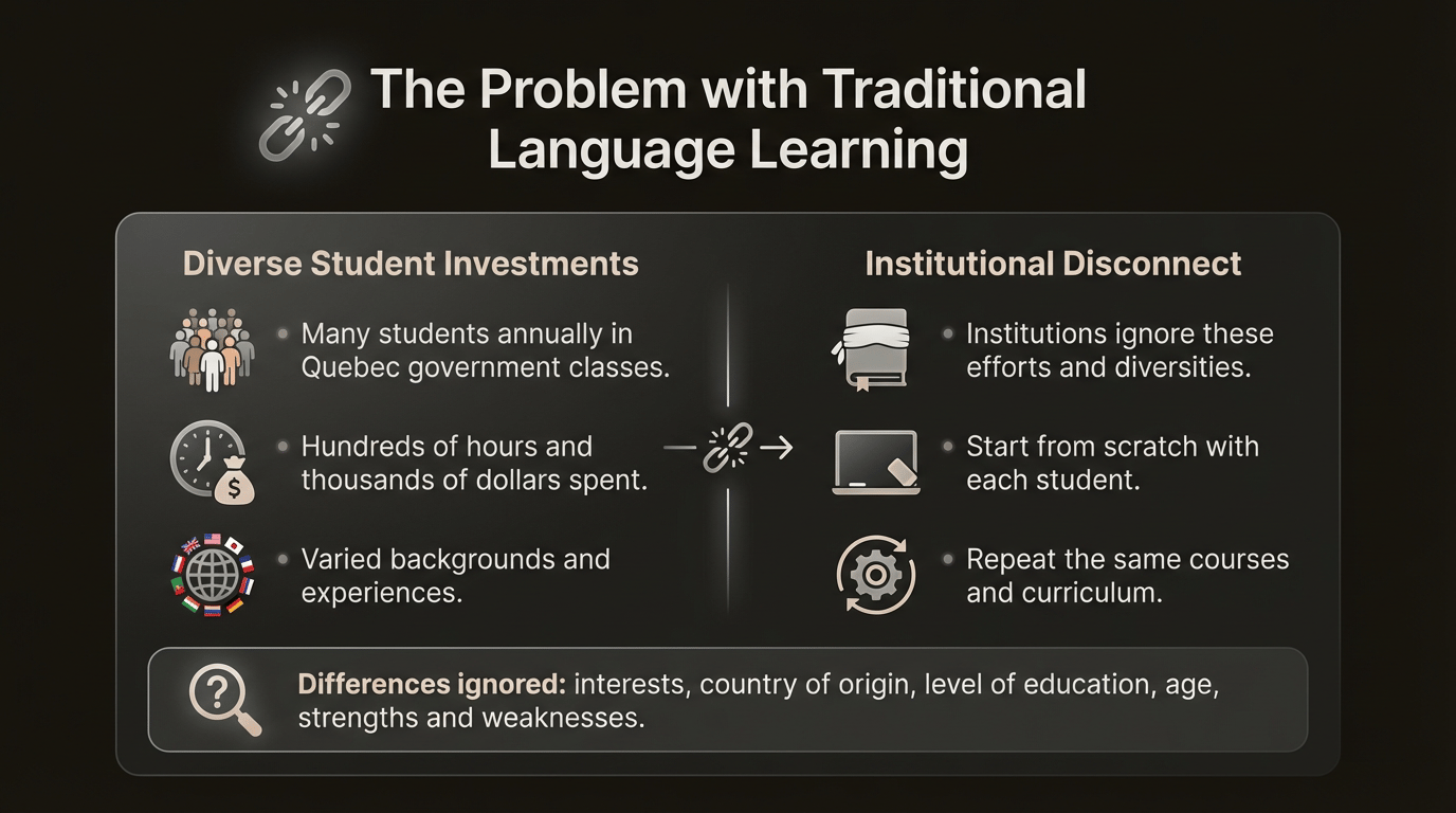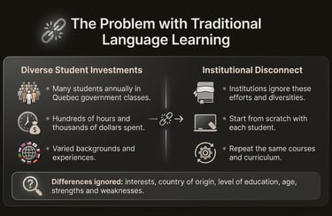 Usually, language teaching institutions ignore all these efforts, information and diversities and start from scratch with each student and repeat the same courses and the same curriculum over and over again without considering their differences (interests, country of origin, level of education, age, strengths and weaknesses)